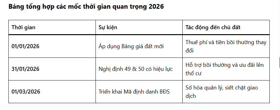 | 01/01/2026 | Áp dụng Bảng giá đất mới | Thuế phí và tiền bồi thường thay đổi |